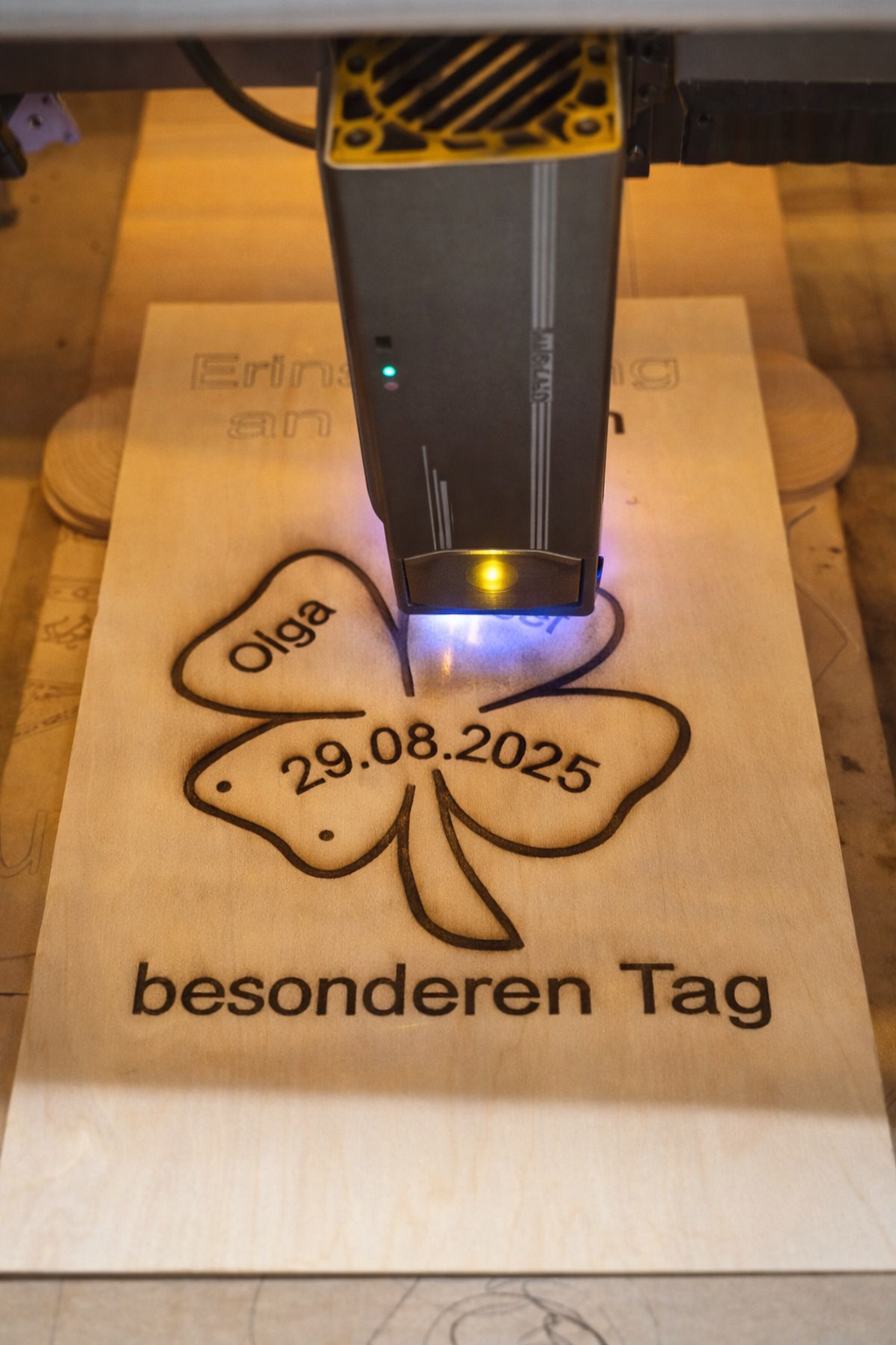 Eine bleibende Erinnerung an einen besonderen Tag – mit viel Liebe gefertigt und direkt beim Laser in präziser Handarbeit umgesetzt.