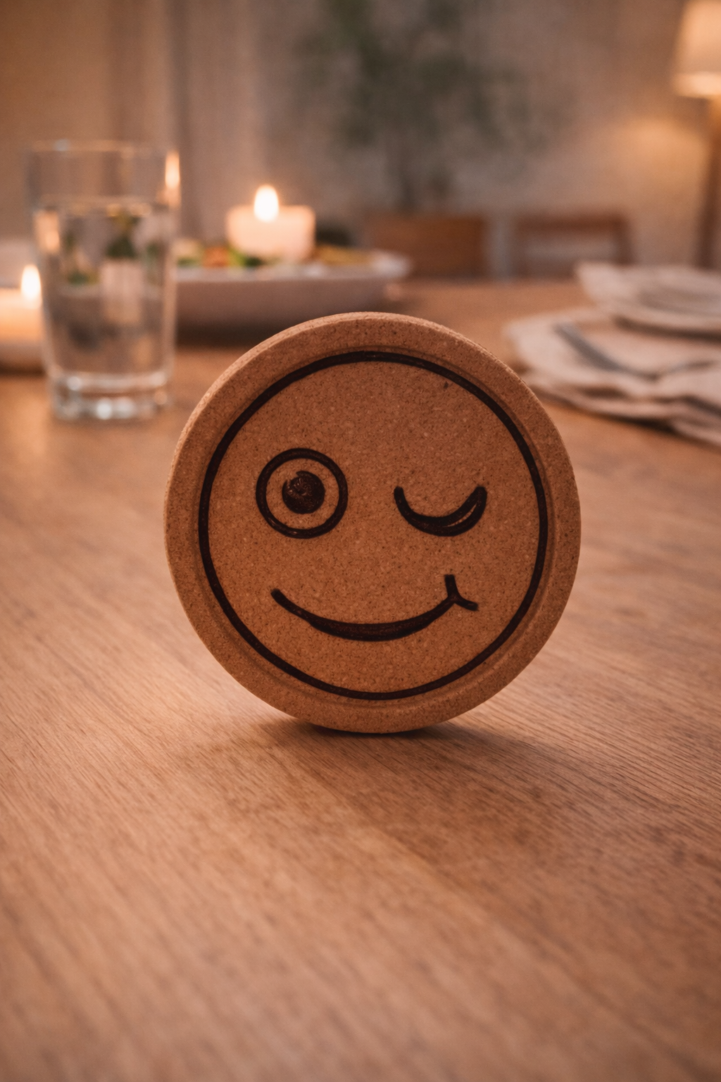 "Zwinkernd genießen – der Untersetzer mit Humor!“ Jedes Motiv und jedes Design kann ganz individuell gelasert werden.